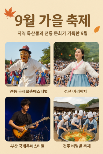 9월은 여행하기 가장 좋은 계절 중 하나로, 전국 곳곳에서 다채로운 축제가 열리며 많은 여행객들이 축제를 즐기기 위해 찾아갑니다. 안동 국제탈춤페스티벌에서는 전통과 세계가 어우러진 공연을 즐길 수 있고, 정선 아리랑제에서는 한국 민요의 깊은 감동을 느낄 수 있습니다. 부산 국제록페스티벌은 젊음과 음악의 에너지를 만끽할 수 있는 최고의 무대이며, 전주 비빔밥 축제는 한국 음식을 통해 함께 나누는 즐거움을 경험할 수 있는 축제입니다. 단순한 여행을 넘어 각 지역의 역사, 문화, 음식, 예술을 모두 만날 수 있는 것이 가을 축제 여행의 가장 큰 매력입니다. 올가을에는 국내 어디를 가든 풍성한 축제가 기다리고 있으니, 일정에 맞춰 계획을 세우고 직접 그 현장의 열기를 느껴보시는 것은 어떠실까요?
